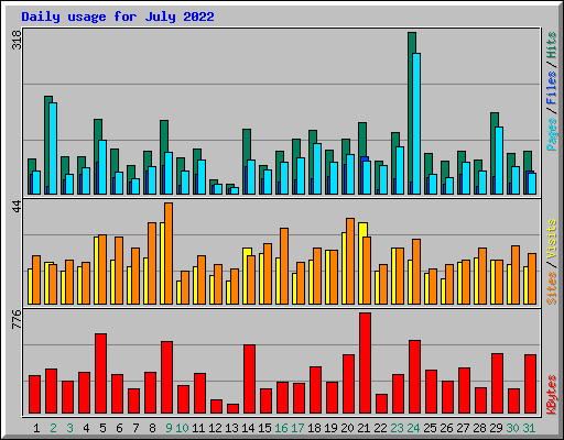 | Day | Hits | Files | Pages | Visits | Sites | KBytes | ||||||